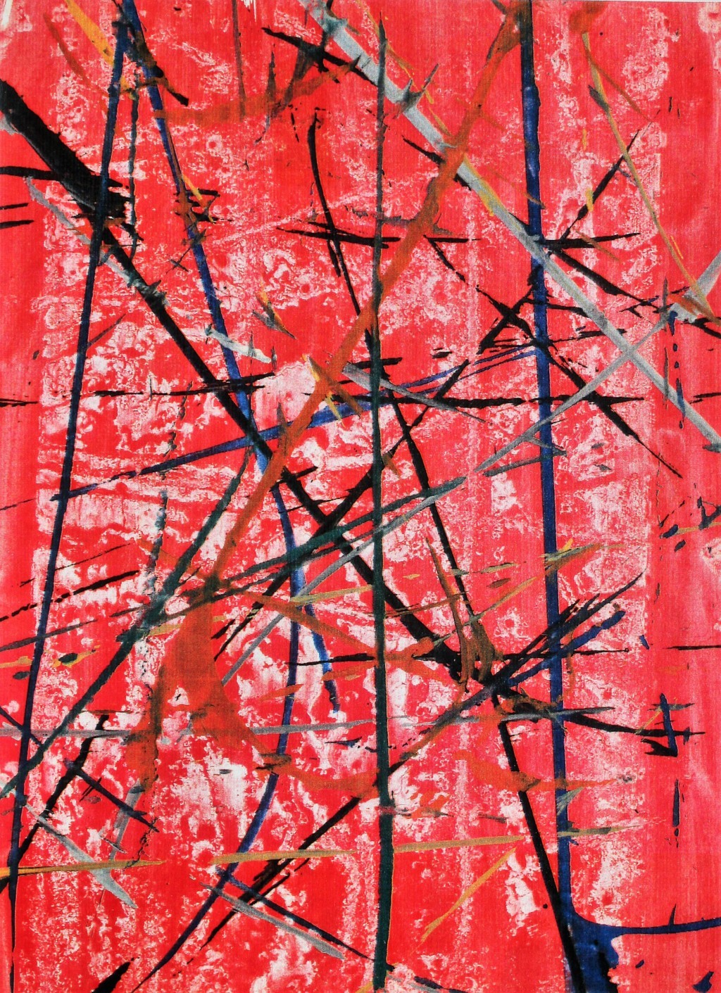 Prima ho fatto il fondo rosso con il monotipo, poi mi sono procurato alcuni fili di lana e li ho immersi ciascuno in un colore diverso.