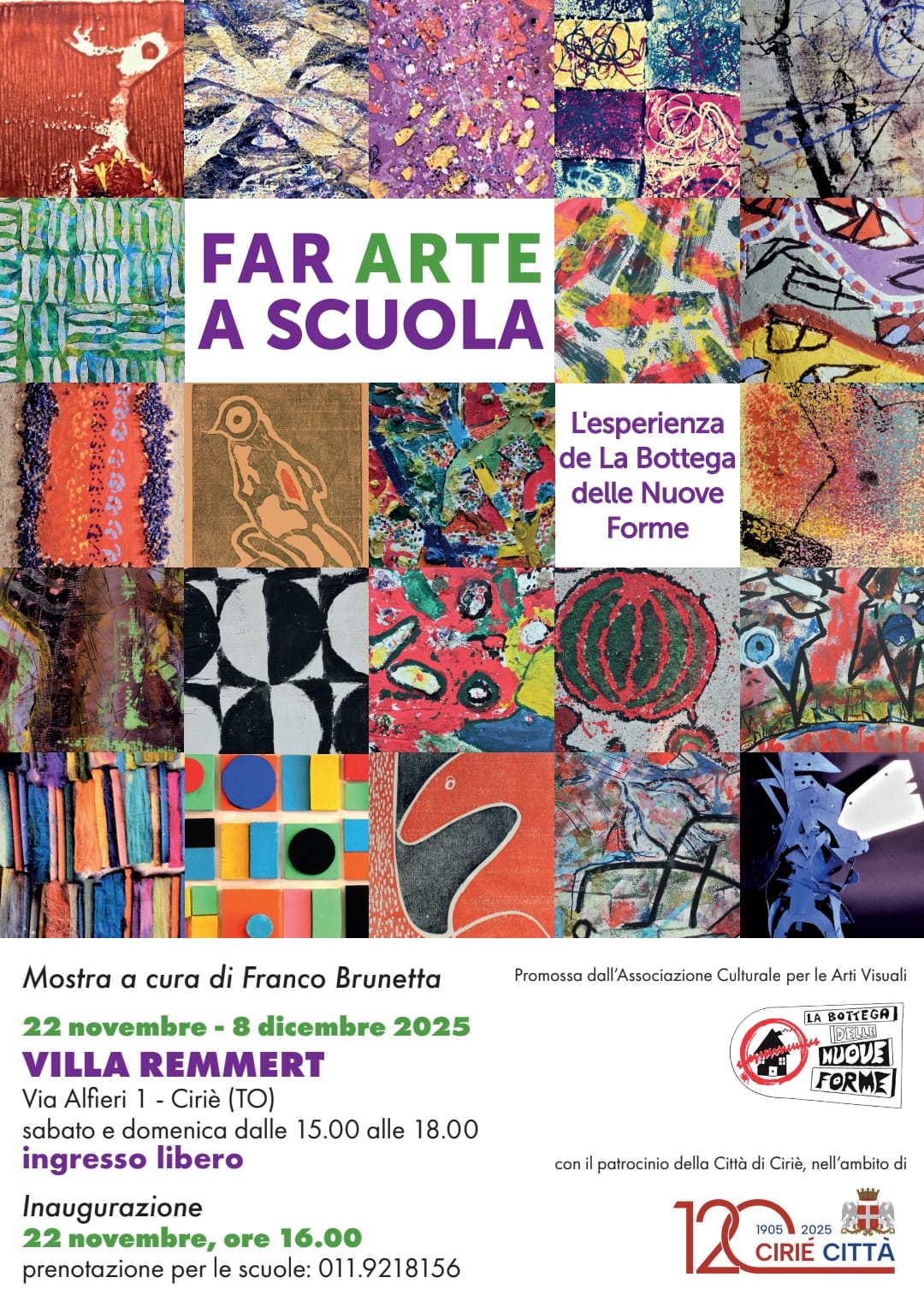 Far arte a scuola - Villa Remmert a Ciriè - dal 22 novembre al 8 dicembre 2025 Scarica il documento qui. Avanti