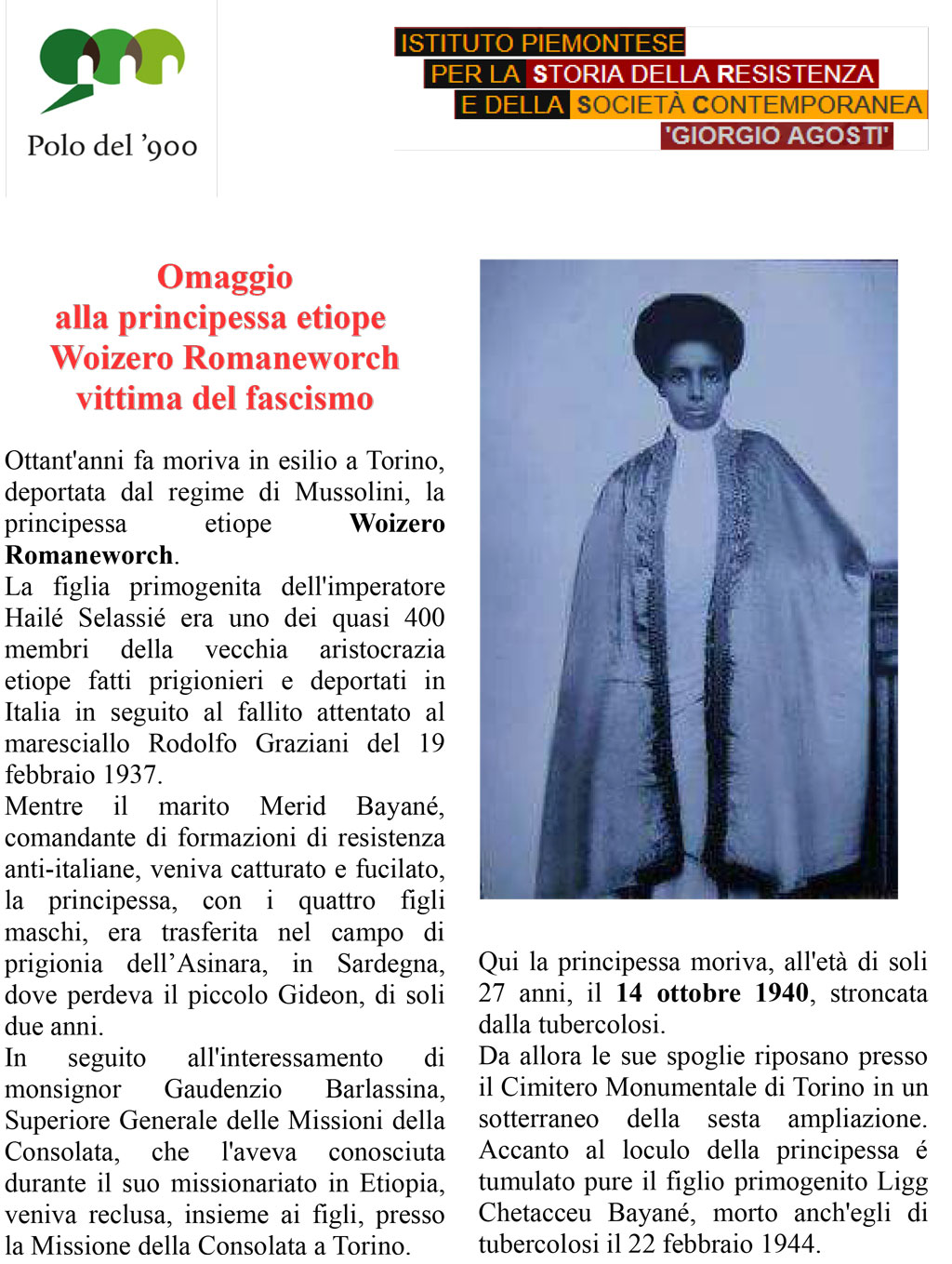 Omaggio alla Principessa etiope vittima del fascismo Scarica il documento 1 qui. Scarica il documento 2 qui. Scarica il documento 3 qui. Prev Next