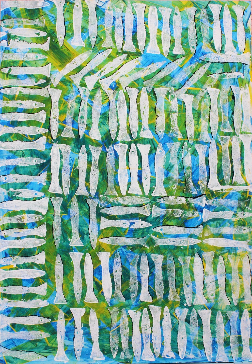 Abbiamo cominciato facendo uno sfondo blu e giallo con i raschietti. La settimana dopo abbiamo pensato ad un lavoro di Davide: l'aveva costruito stampando i manici del pennello, però, usando solo quelli con il buco in fondo; così poteva ricavare la forma di un pesce con l'occhio aperto.
